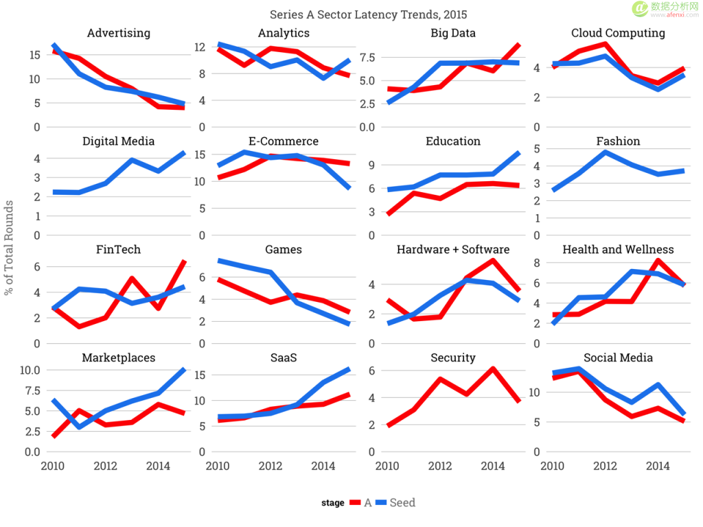 基于Crunchbase的数据,我分析了在过去5年里信息科技16个领域中每一个领域的投资市场份额变化。以上的图表以每个领域在年度投资额中所在的百分比的形式,对比两种投资在各个领域的变化情况,其中种子投资用蓝色表示,而A轮融资用红色表示。