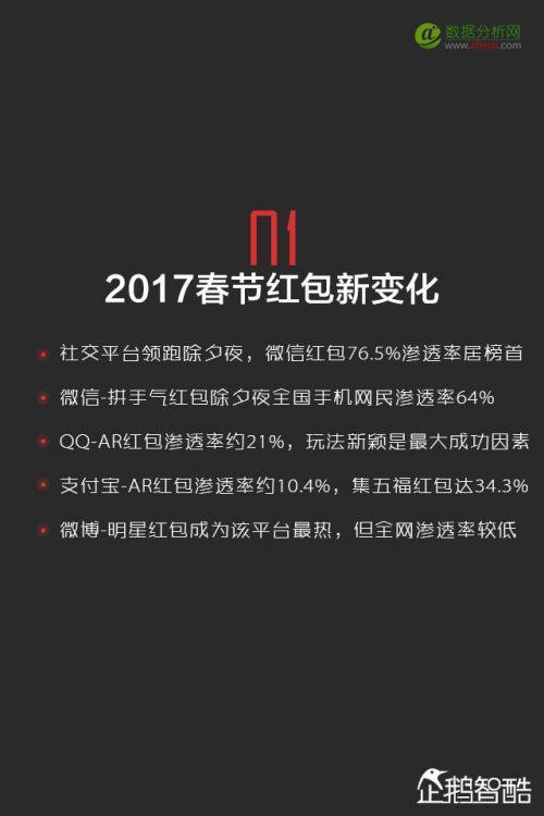 为了准备这份报告,企鹅智酷联合CDC,对过去两年多来的红包全网用户数据进行了充分调研和精准抽样,并结合红包场景和产品,进行了深度分析解读——