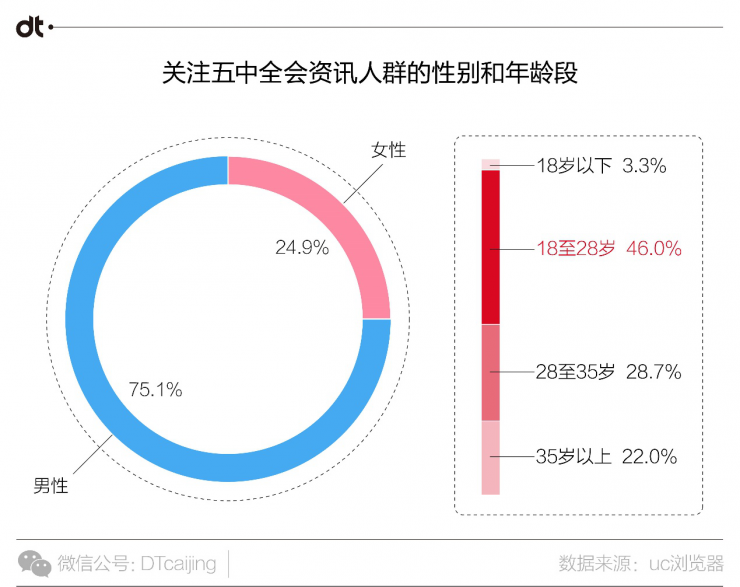 在关注五中全会相关资讯的人群中,男性占到了75%。当然,男人本来就是更关注新闻的动物,UC浏览器资讯用户中他们占比也高达73.5%。