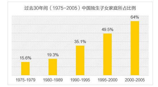 根据2005年1%人口抽样调查,1975年到1979年出生人口中独生子女占15.6%;1980年到1989年独生子女比例稳定在19.3%左右。2010年人口普查显示独生子女比例不断提高——1995年是35.1%、2000年是49.5%、2005年达到64%。