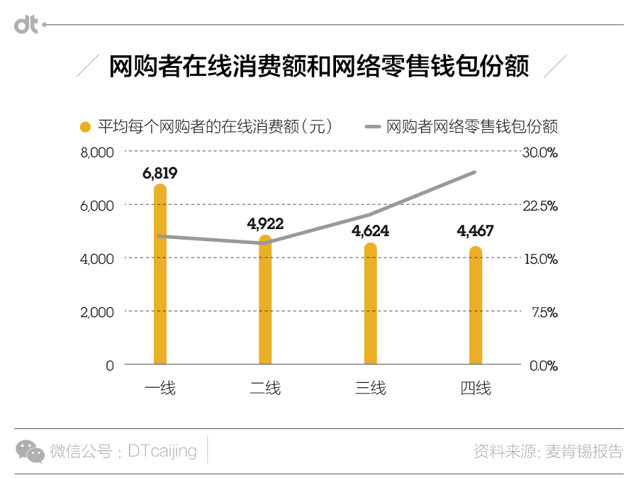 麦肯锡报告称,四线城市的人均收入水平较低,但其实是在网购消费金额上与二三线城市维持了相近的水平。而且四线城市的网上消费量在可支配收入的占比可是结结实实地高过了一二三线城市!