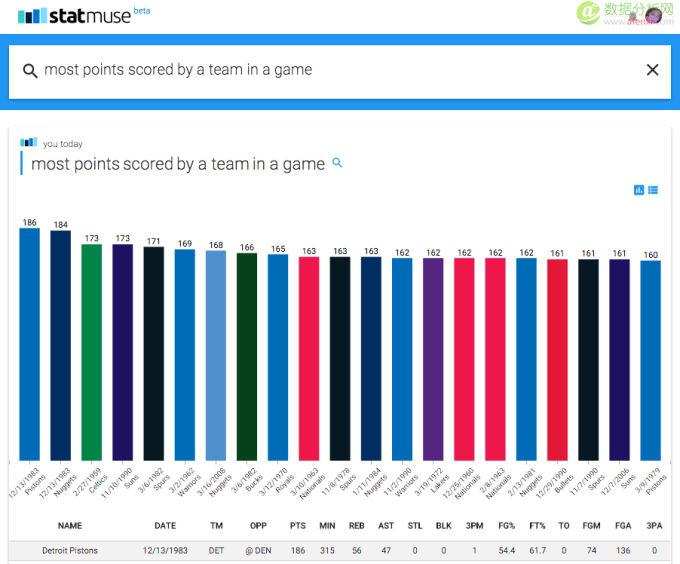 比方说你输入 “得分最高的球队” 之后,结果可以以图表或列表的方式展现出来,非常的直观。而类似的问题是非常开放性的,没有太多语法上的约束。随后这些信息可以通过 Facebook、Twitter 等社交媒体分享出去,而 StatMuse 本身也有社交机制,用户之间可以互粉,从而有可能形成一个体育迷的社区,进而开发其他的可能性。