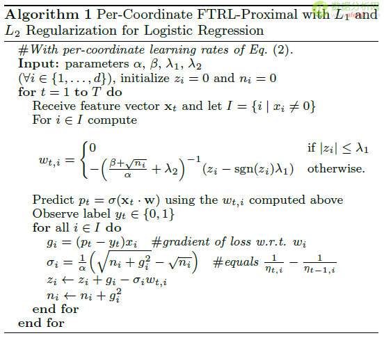 FTRL-Proximal,KDD 2013 google的论文,带工程实现伪代码,相信当前online learning的实现大都是参照这边paper来的。FTRL-Proximal,融合了RDA和FOBOS的特点,论文的实验对比,在L1正则下,稀疏性与精度都好于RDA和FOBOS。 FTRL,即Follow The Regularized Leader。FTRL-Proximal的形式上与RDA只有第三项不同,如下,