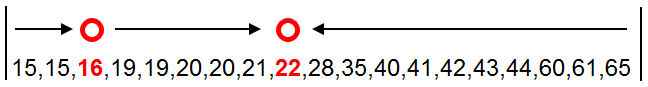 我们以图的形式展示聚类的过程。在这组年龄数据中,我们选择了16和22作为两个类别的初始质心,并通过计算所有用户的年龄值与初始质心的距离对用户进行第一次分类。