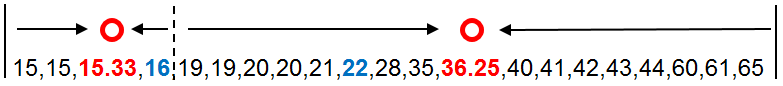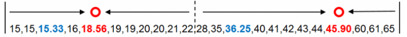 按照年龄数据点到新质心的距离对数据进行分组,并计算每组的均值作为新质心。这里两组的均值与原质心相等。也就是说新质心与原质心相等,都是19.50和47.89.。算法停止计算。年龄数据点被划分为两类,如下图所示分别为15-28和35-65。