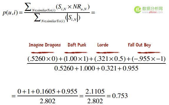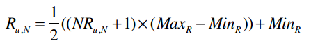 我们的音乐评分系统是5分制,MaxR表示评分系统中的最高分(这里是5),MinR为最低分(这里是1),Ru,N是用户u对物品N的评分,NRu,N则表示修正后的评分(即范围在-1和1之间)。
