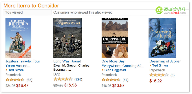 在这个示例中,亚马逊记录了用户的点击操作,因此它会知道浏览了Jupter Travel这本书的用户还浏览了Long Way Round这部DVD,其详细记录了演员伊万环球骑行的旅程。因此,亚马逊就用这些信息来做出“看过还看过”的推荐。