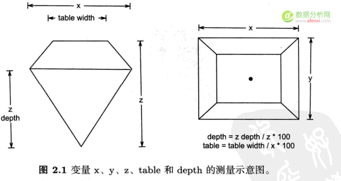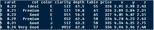这里我使用的是R语言里面数据集diamonds,如果看这本《ggplot2:数据分析与图形艺术》应该对这个数据都不会太陌生。该数据集收集了约54000颗钻石的价格和质量的信息。每条记录由十个变量构成,其中有三个是名义变量,分别描述钻石的切工,颜色和净度;