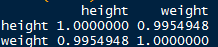 从相关系数的结果上看,身高和体重的相关程度高达0.9954,可以认为是完全有关系的。