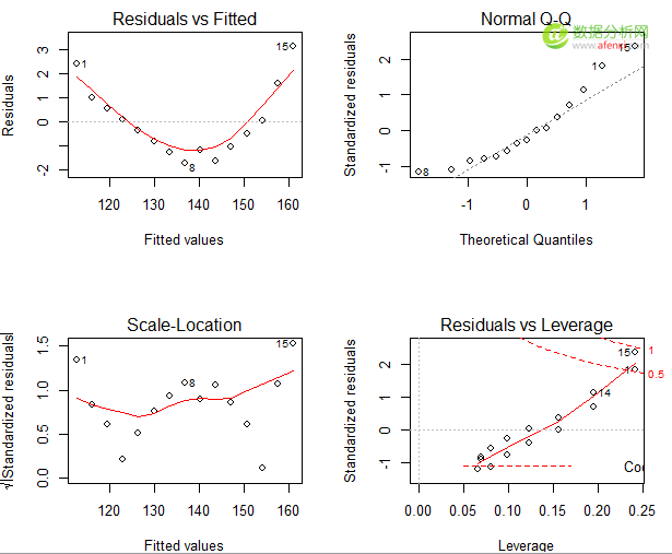 左上:代表的残差值和拟合值的拟合图,如果模型的因变量和自变量是线性相关的话,残差值和拟合值是没有任何关系的,他们的分布应该是也是在0左右随机分布,但是从结果上看,是一个曲线关系,这就有可能需要我们家一项非线性项进去了 右上:代表正态QQ图,说白了就是标准化后的残差分布图,如果满足正态假定,那么点应该都在45度的直线上,若不是就违反了正态性假 左下:位置尺度图,主要是检验是否同方差的假设,如果是同方差,周围的点应该随机分布 右下:主要是影响点的分析,叫残差与杠杆图,鉴别离群值和高杠杆值和强影响点,说白了就是对模型影响大的点