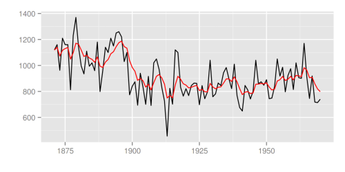 library(dlm) form <- function(theta) model <- form(dlmMLE(Nile, parm = c(1, 1), form)$par) filtered <- dlmFilter(Nile, model) autoplot(filtered)