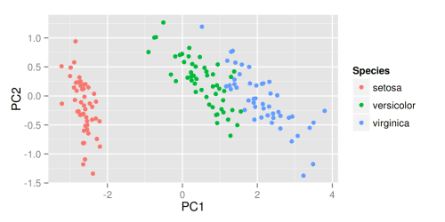 接下来我将简单介绍一下怎么用 ggplot2 和 ggfortify 来很快地对PCA、聚类以及LFDA的结果进行可视化,然后将简单介绍用 ggfortify 来对时间序列进行快速可视化的方法。