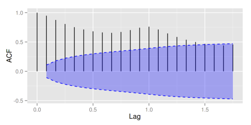 autoplot(acf(AirPassengers, plot = FALSE), conf.int.fill = #0000FF, conf.int.value = 0.8, conf.int.type = ma)