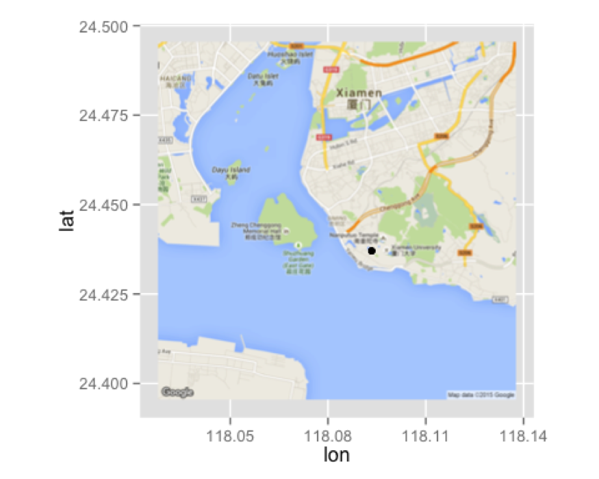 当当当,奇迹发生了——厦门大学位于海中央!这是因为谷歌地图和百度地图经纬度坐标存在一定的偏差, 而getBaiduMap()软件包的作者利用了ggmap()包中坐标转换的思想,这导致最终绘制出来 的图形不准确。因此,我们还是考虑转入谷歌阵营。