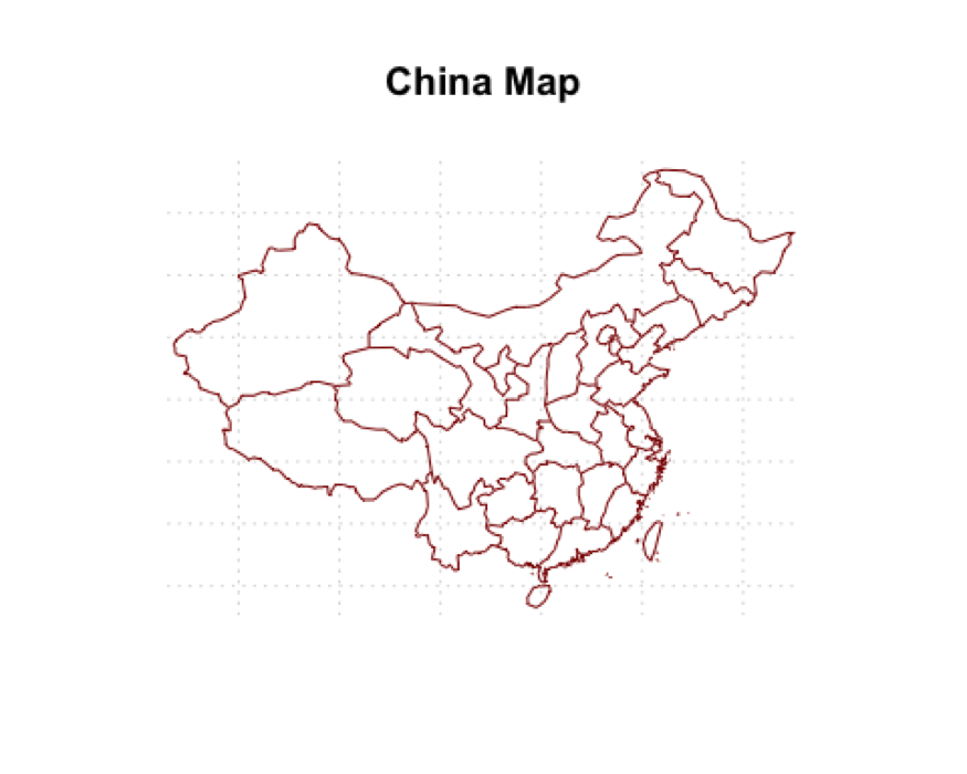 # 中国地图 library(mapdata) map("china", col = "red4", ylim = c(18,54), panel.first = grid()) title("China Map")