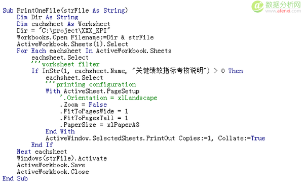 于是写下了我的第一个VBA程序,而且基本上是宏录制之后来改的,没有使用参考书及搜索引擎,全靠F1和自动提示,所以贴出来特别纪念一下。实现的功能就是将上述的人肉实现的功能全部自动化。按下一个妞,就慢慢等着打印机按顺序出结果吧。