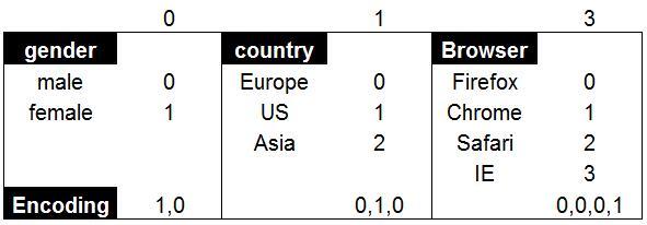 这里我们新增了一条男性,US,IE浏览器的记录,被标记为0,1,3。使用OneHotEncoder将条记录转换为哑编码。下面是具体的过程。首先在gender中,male=0,female=1,因此第一个数字0被转换为1,0,即男性。以此类推第二个数字1在country中被转换为0,1,0,。第三个数字3在browser中被标记为0,0,0,1。男性,US,IE浏览器的记录0,1,3通过OneHotEncoder转换为1,0,0,1,0,0,0,0,1。