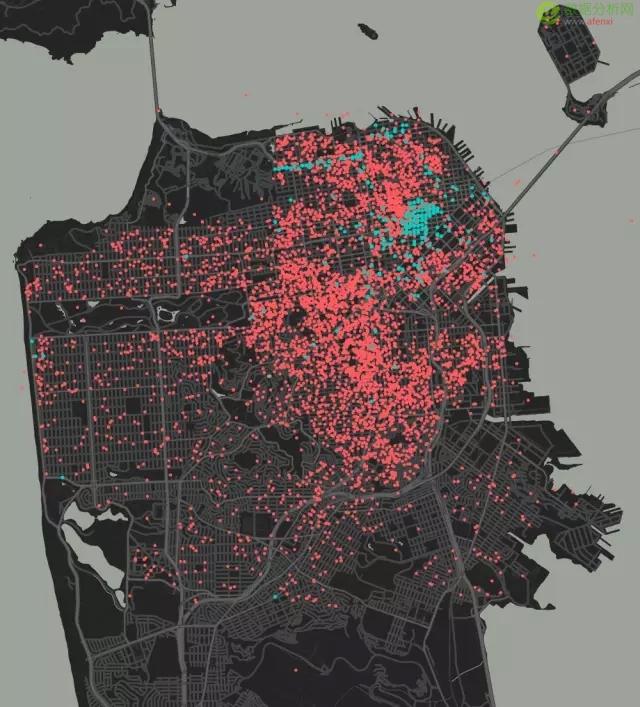 (Airbnb accommodations (red) and traditional accommodations (blue) in San Francisco)