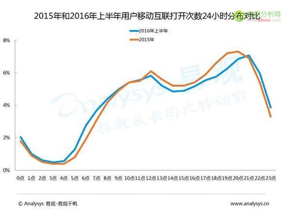 2015年的夜晚活跃峰值时间点为20点,2016年上半年活跃峰值时间点为21点,夜晚的活跃峰值后移,人们更倾向于晚睡,移动互联正悄悄改变人们的作息。