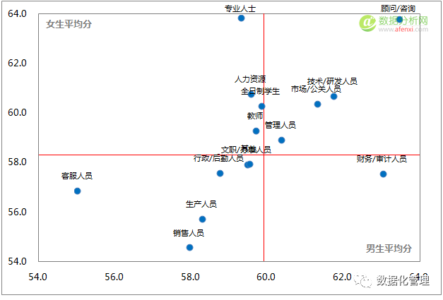3、按从事的工作来看,顾问和咨询得分最高,这和他们日常的思维模式是分不开的,相反销售人员和客服人员的平均分最低,销售人员其实更应该有数据思维的,只是现在的销售门槛太低,什么人都可以做销售,而且企业也不重视对他们的数据分析培训。管理人员的平均分只有59.9分也是没有想到的。