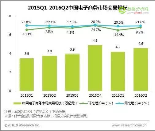 2016Q2中国电子商务市场交易规模为4.6万亿,同比增长21.6%