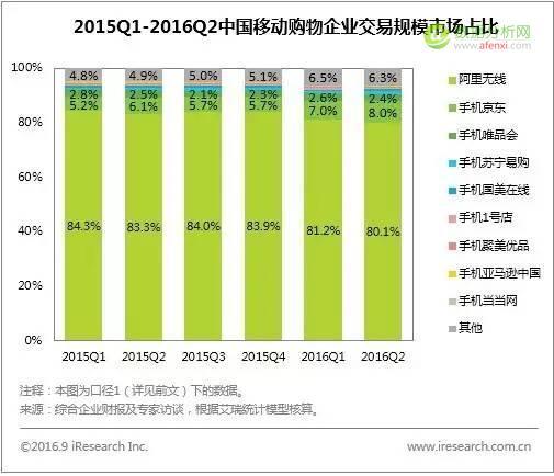 从整体上看,移动购物市场集中度依然很高,但相较前几个季度继续下降。从企业份额来看,2016Q2阿里无线依然稳居首位,占比为80.1%;由于618大促,京东移动端市场份额持续增长至8.0%。唯品会、聚美优品、蘑菇街等时尚电商的移动端在整体交易额占比中均达超八成。而随着垂直电商不断发力、农村电商兴起、直播等内容运营方式的火热,其他电商企业移动端交易也占据了一定的份额。