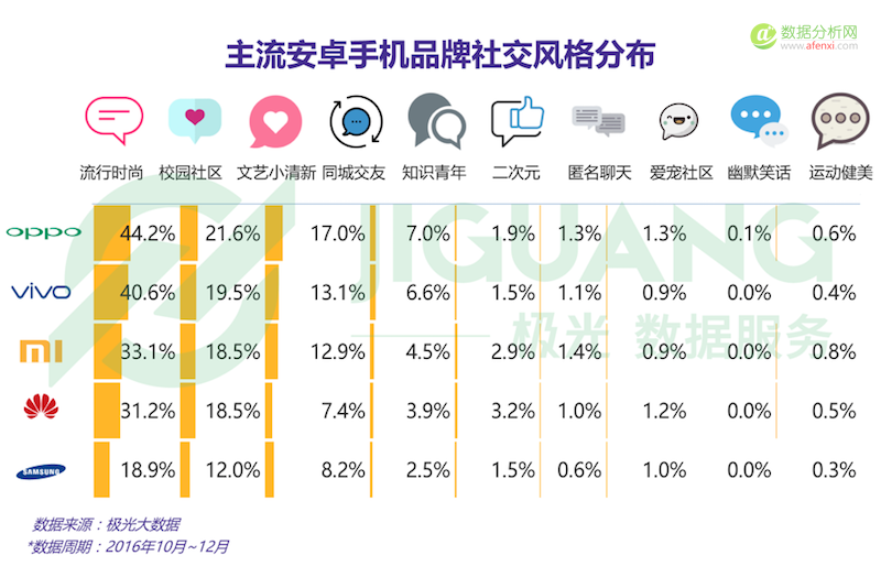 在性别上,极光大数据显示三星、华为和小米的男性用户占比分别为 76%、67% 和 63%,OPPO 和 vivo 的女性用户占比分别为 59% 和 53%。可见三星、华为和小米备受男性用户青睐,OPPO、vivo 则更受女性用户欢迎。