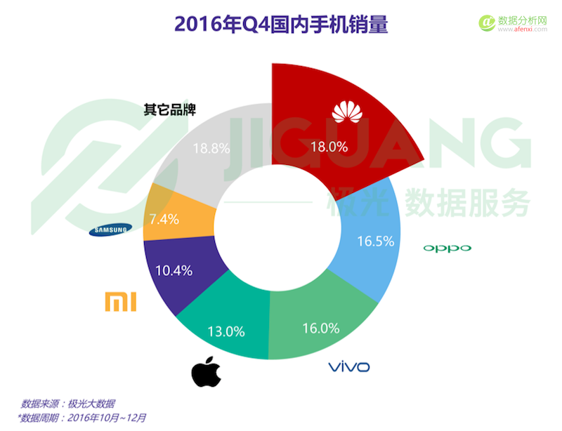 极光大数据显示,在 2016 年 Q4 国内手机销量份额上,华为以占 Q4 总销量 18% 的表现斩获 Q4 销量王,OPPO、vivo 紧随其后。
