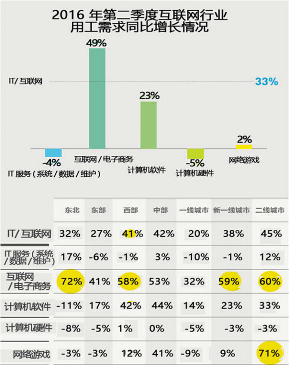 智联招聘和中国人民大学中国就业研究所发布的《2016第二季度中国就业市场景气报告》数据显示,以电子商务、物流为代表的与互联网有关联的行业就业形势一片大好,而以能源、制造等传统生产制造为代表的行业就业减退。