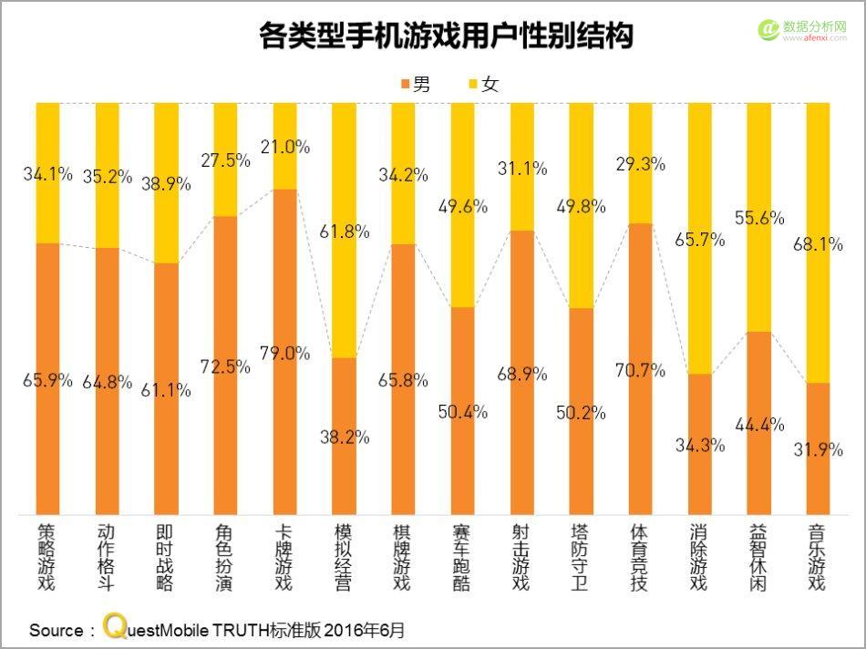 从年龄结构来看,音乐游戏用户中24岁及以下比例超过半数,还记得前面的时段吗?你懂的。策略游戏用户中36至40岁的比例超过3成,棋牌类游戏的高龄用户比例领先,低龄用户比例最少。