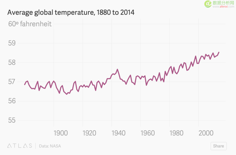当有人说所有折线图的y轴都应该以0为起始点时,我们都应该想想这张图。全球平均气温即使仅仅变化了1度,也会影响巨大,但这张图从零开始计数,气温的变化就显得微乎其微了。正如记者David Yanofsky在他的文章《y轴不以零起始也完全可以》里所说,当你画出口腔温度变化图,y轴从零开始计,就会变成下图这样: