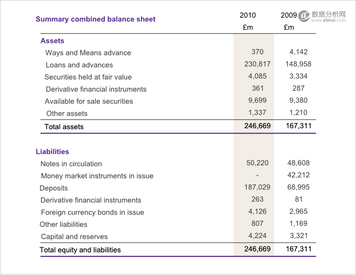 其实类似上一点,表格的指标也不是永远固定的,而是从读者阅读表格的目的出发,调整所需展示的指标。在原始数据的基础上给出差值、总计等分析性的数据,可以直达用户阅读的目标,而尽量减少用户心算或者线下处理的过程。例如下图展示了2010年与2009年两年的公司财政报表,查看两年的具体数据当然必要,但深入分析,读者之所以要并列查看两年的数据,目的在于对比两年的数据变化,因此将指标变化情况列出能帮助用户更快的达成目标。