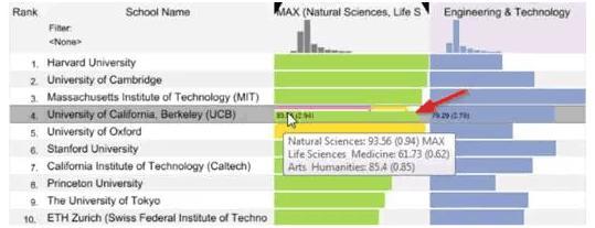 LineUp是一种用来创建、可视化、探究多属性数据项排序的交互技术,该技术基于不同形态的柱状图,本文以《泰晤士报》评选出的前100强大学中的50强为例。