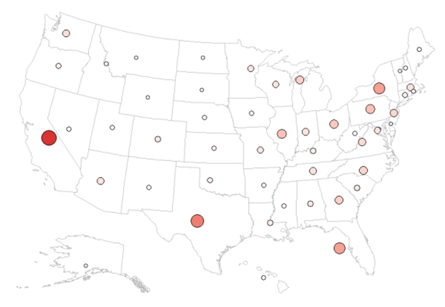 接下来将会以四个数据地图的形式向大家展示美国总统大选结果中,各州选票分布,以及各州对希拉里、川普的支持率可视化信息。