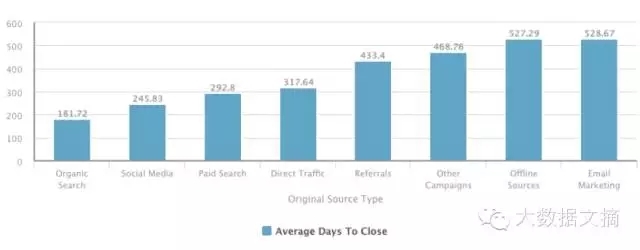 在下面的例子里,我们把销售周期的速度绘制成一张柱状图,根据最初的销售来源进行细分。根据这个报告,我们试图了解哪个来源带来最快变现的潜在客户,以及哪个来源潜在客户变现最慢。