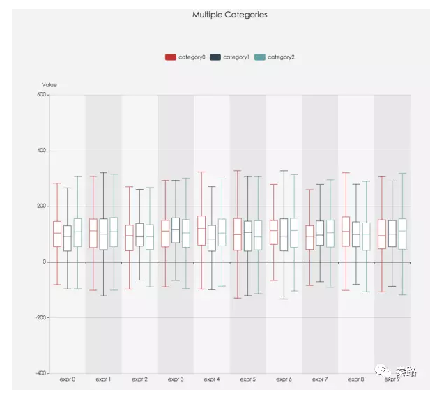 下图就是箱线图的典型应用。线的上下两端表示某组数据的最大值和最小值。箱的上下两端表示这组数据中排在前25%位置和75%位置的数值。箱中间的横线表示中位数。